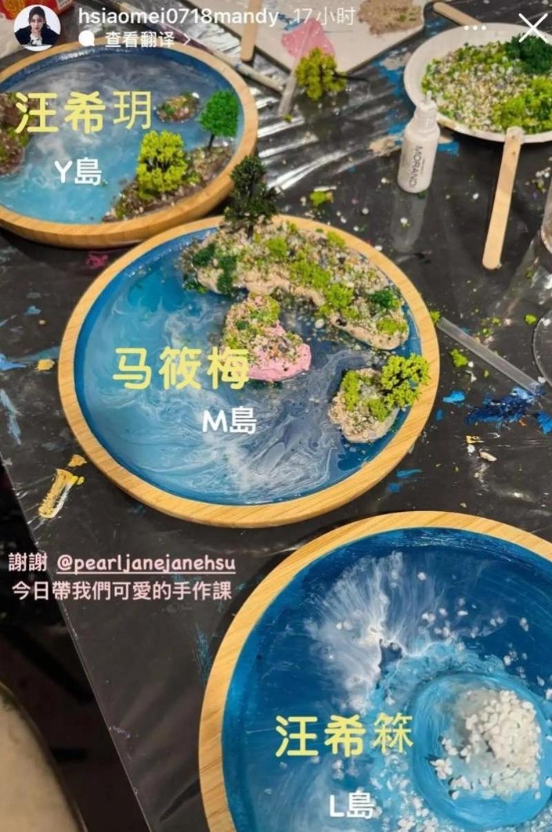 從Mandy曬出的照片中,三個作品剛好和大S孩子們的名字,以及她自己的名字對上了。像是最上面的「Y」島是小玥兒的「Yue」;中間的「M」島是馬筱梅自己做的,最下面的「L島」是汪希箖製作的。