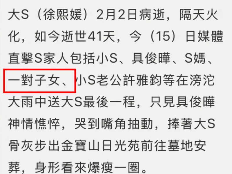 當時,根據台媒報道,除了S媽之外,一對兒女和小S等親屬都現身送大S最後一程!