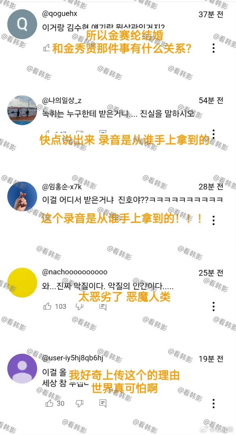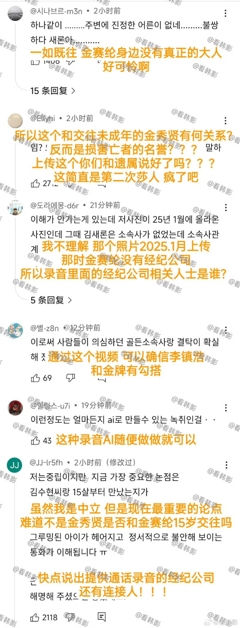 而不少網友對於金賽綸的看法,則是覺得她真的很可憐,身邊沒有真正的好人,甚至反問結婚和交往未成年的金秀賢有什麼關係?並認為這個錄音,更錘了金牌和李鎮浩真的有關係!
