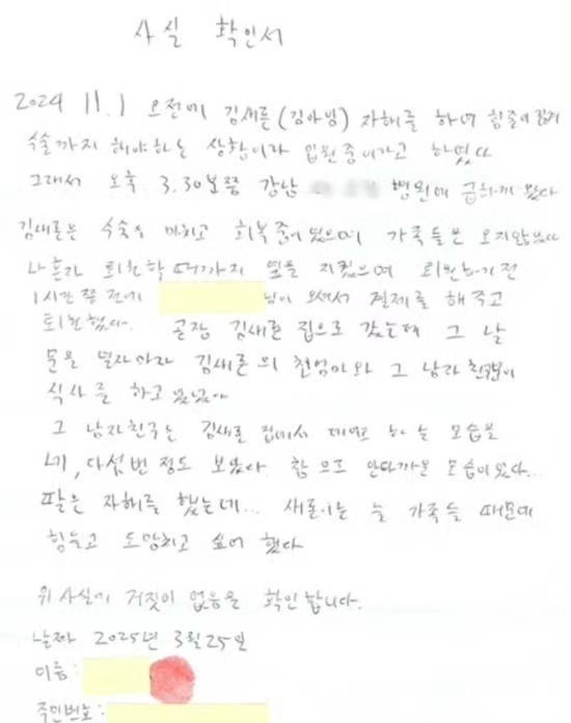 為了證明舉報真實性,K某提供了附有身份證號和指印的確認書,並公開了金賽綸在首爾江南D醫院急診室治療時的錄音證據。當時金賽綸寧可向熟人求助「肌腱全斷需自費500萬手術費」也未聯系家人,足見其孤立無援的處境。確認書全文如下👇