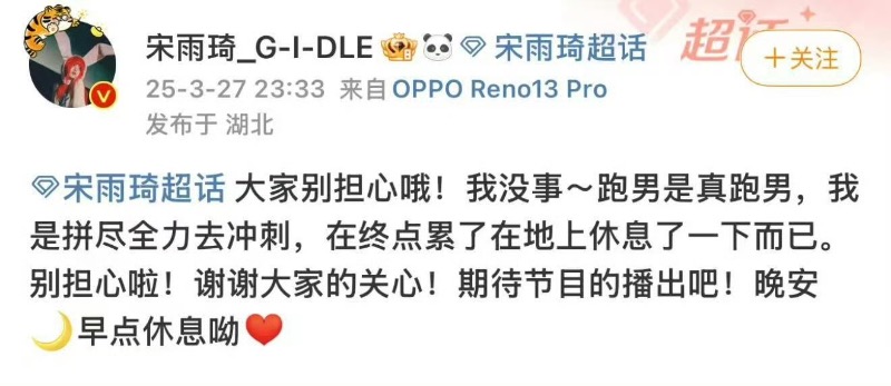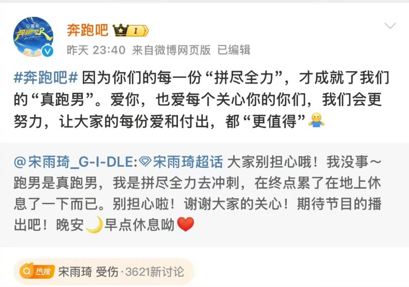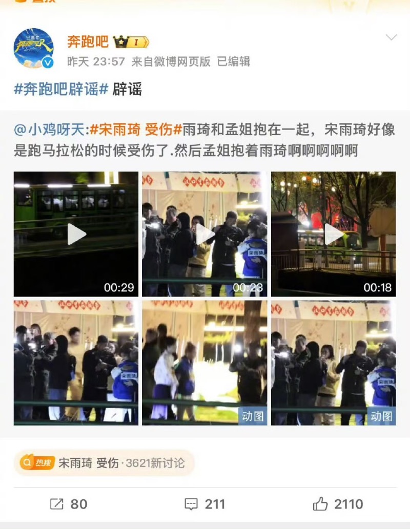 沒想到錄製才剛開始,就傳來藝人發生意外?奔跑團的「宋雨琦 受傷」上了高位熱搜👇