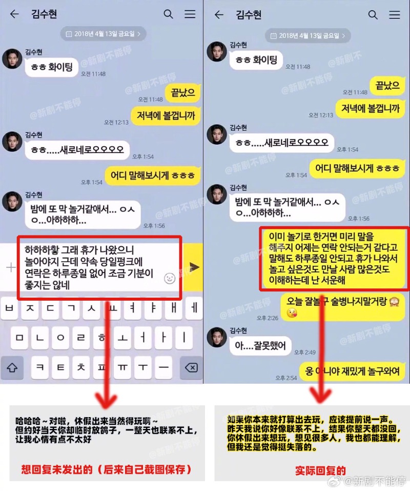 被金秀賢放鴿子一天的金賽綸,被爽約後,左邊是準備給金秀賢回的內容,但最終沒有發出,最終換成了右邊的內容。對比可以看見,從本來的不滿生氣,但體諒,從強調「你爽約一天,你失聯」,到「我體諒你,但還是難過」