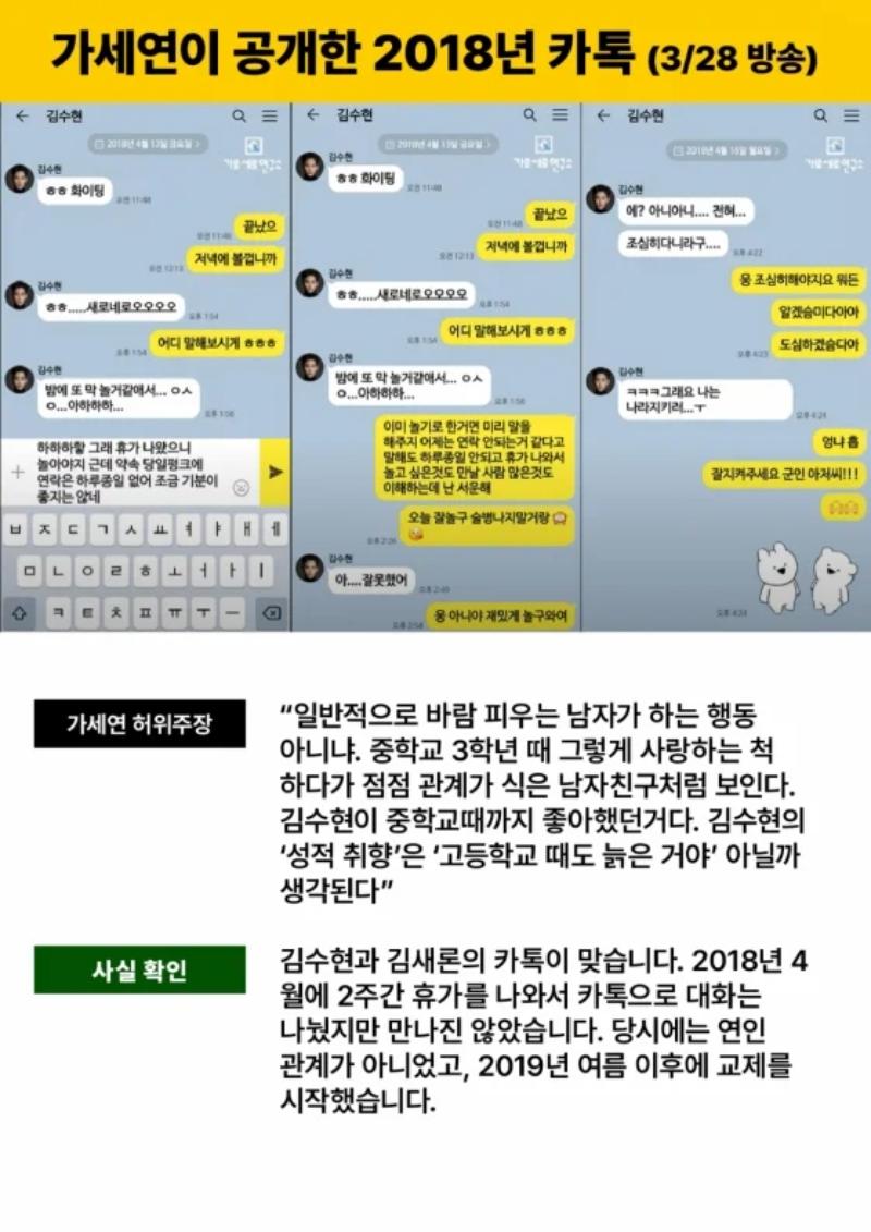 金秀賢回應:聊天記錄是真的,2018年4月休假兩周的聊天記錄,但是沒有見面,而且當時他們兩個不是戀人關係,2019年夏天之後才開始交往。