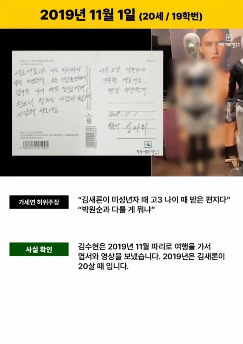 金秀賢回應:金秀賢在2019年11月去巴黎旅遊,給金賽綸發了明信片和視頻,2019年金賽綸是20歲