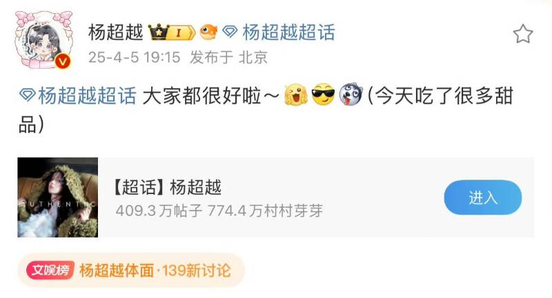 之後,楊超越甚至還空降自己的超話,表示:「大家都很好啦~」一句話帶過了當年的網暴👇