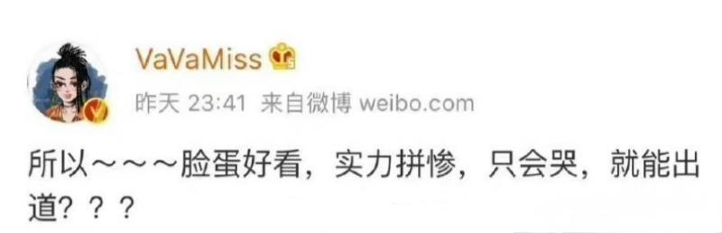 當時Vava更是直接上大號發文,直接diss楊超越「臉蛋好看,實力拼慘,只會哭,就能出道???」這則微博當時引起了極大討論度,轉發和點讚都很高,楊超越也遭受了不少爭議👇