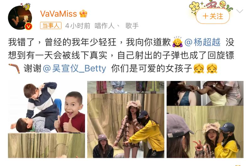 在3人逛街的路透流出之後,Vava發文向楊超越道歉,表示自己曾經年少輕狂,沒想到會被線下真實,自己射出的子彈也成了回旋鏢👇