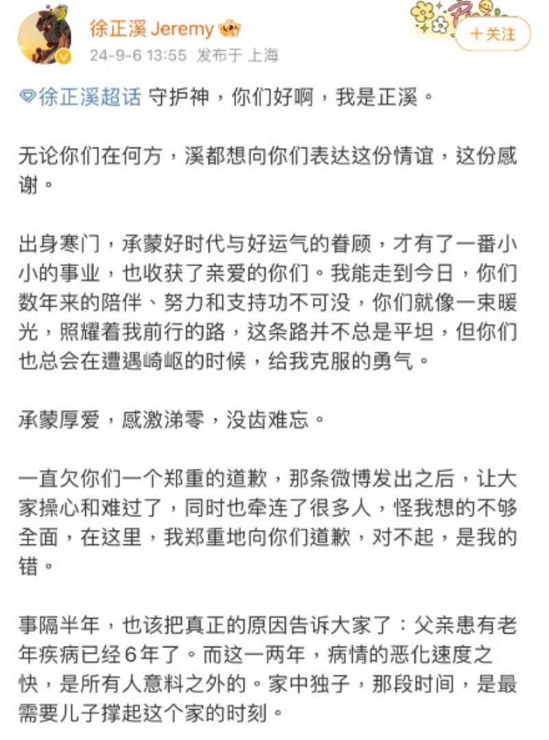 而在退圈半年之後,他發長文解釋退圈原因,原來是為了照顧生病的父親!