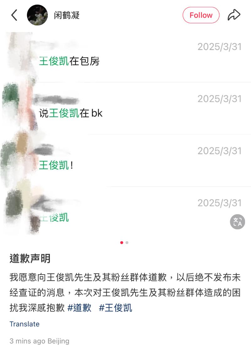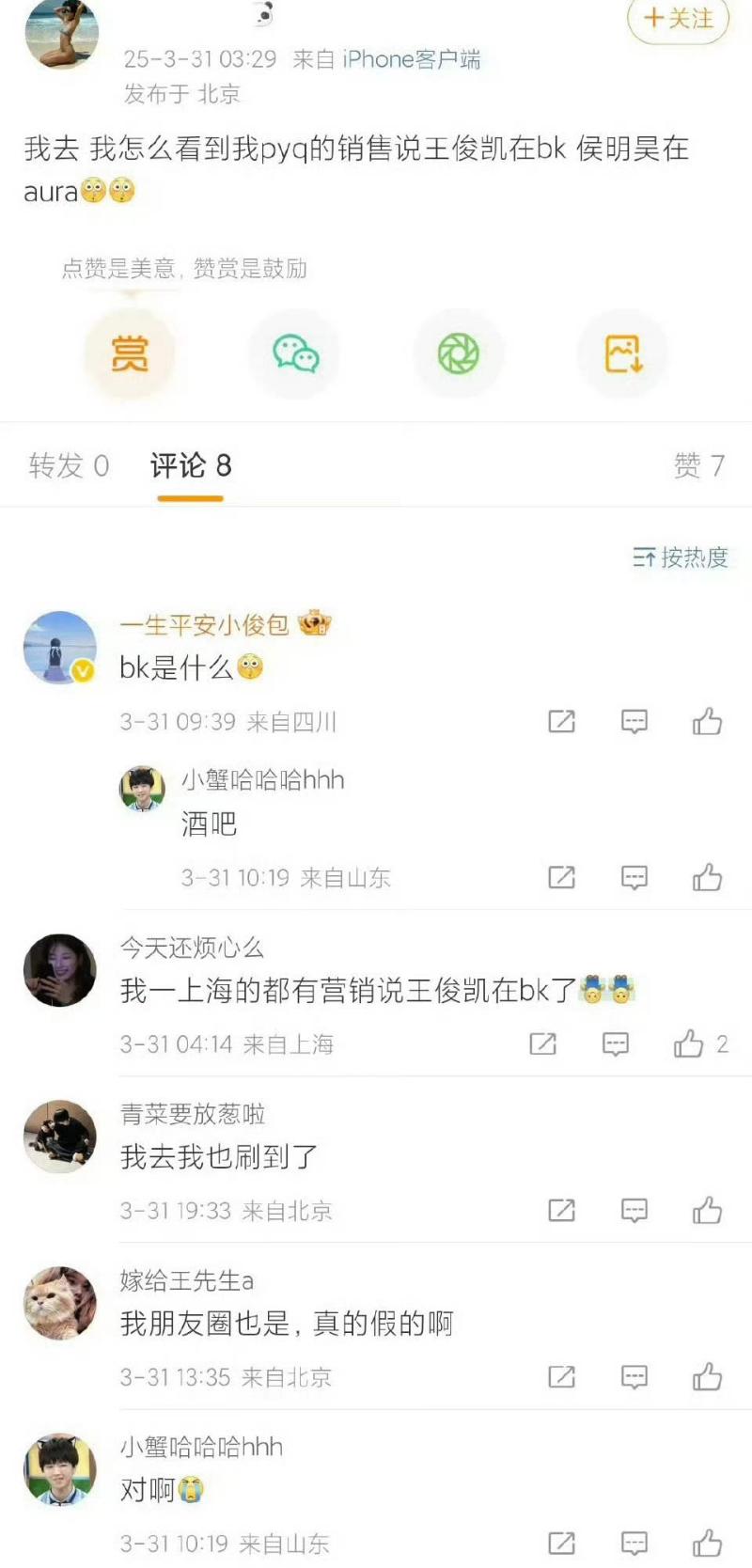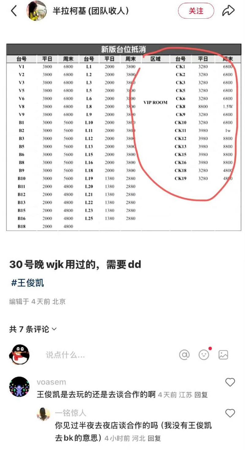 原來是從3月底開始,就有自稱是北京某知名夜店的員工,發文表示王俊凱去了自己的夜店👇