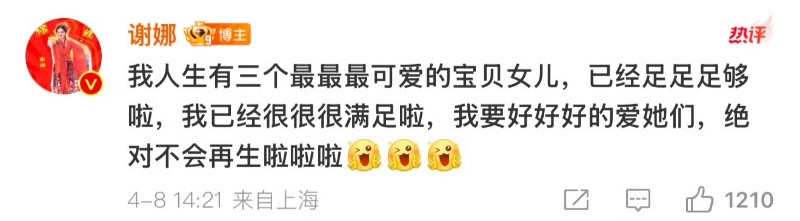 隨後謝娜也在評論區表示,自己擁有三個可愛的女兒,不會再想要第三胎了👇