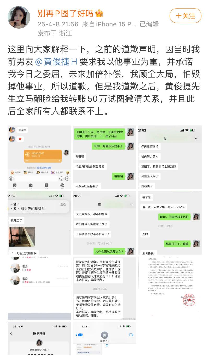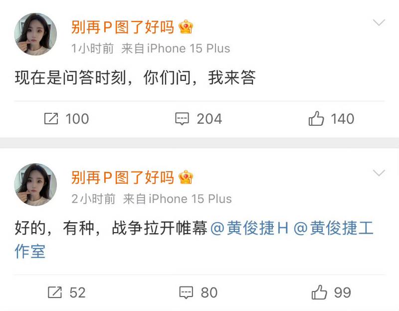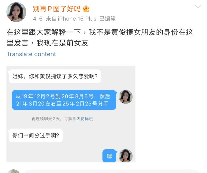 到底怎麼一回事呢?簡單來說,今年2月份有個女生「別再p圖了好嗎」發文自稱是黃俊捷前任(目前又複合了,還在一起版),但最後又發微博說自己撒謊騙了大家。原以為事情就到此為止,沒想到過了兩個月,這女生又發文表示自己已經和黃俊捷分手,現在是前女友,並回應自己和黃俊捷從2019年談到2025年,當中分過一次。