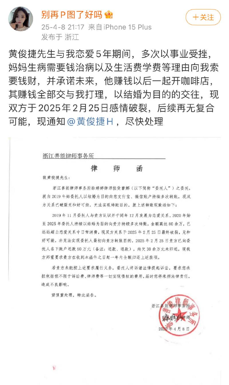 事情發酵了一天之後,P圖姐發文曬出律師信,表示自己和黃俊捷戀愛五年,于2025年2月25日感情破裂,無複合可能。此前多次向她索要錢財,現在她要追回,對方已經返還50萬,還有30萬限期一年內全部還上👇