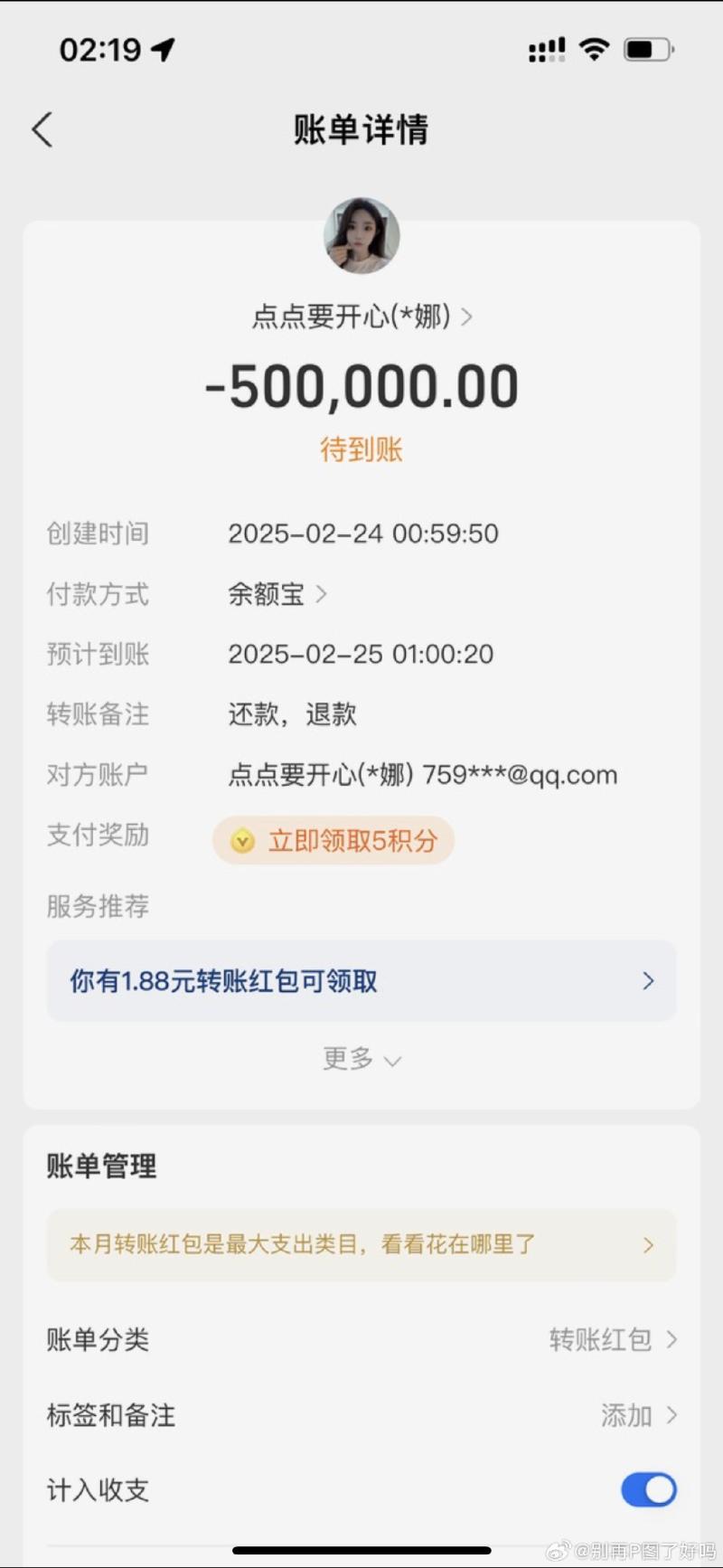 由於粉絲質疑真偽性,P圖姐直接曬出了其中一張轉賬記錄,並表示其他都交已給律師👇
