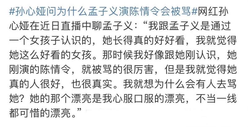 沒想到過了這麼多年,2025年孟子義又又和《陳情令》關聯在一起了!起因是因為網紅孫心婭,在直播中提到了自己和孟子義的初見面,大讚她長得很漂亮,並表示不明白為什麼當時她會被罵的那麼慘!