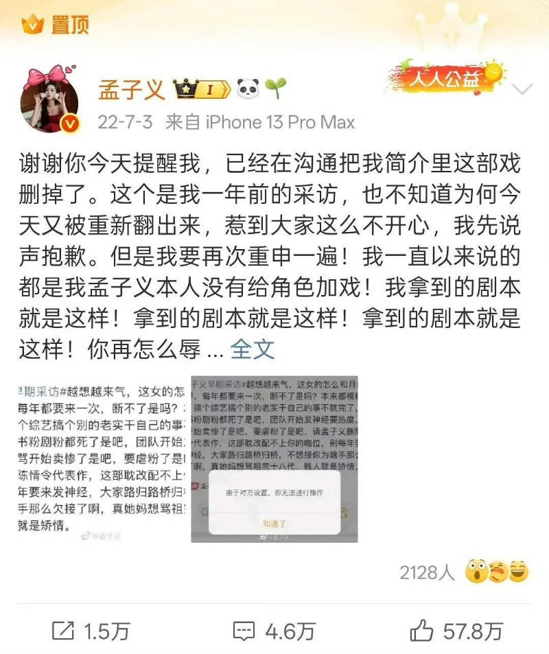 隨著上了熱搜,孟子義被發現再次置頂了2022年回應否認加戲的貼文,被指正面剛黑粉流言👇