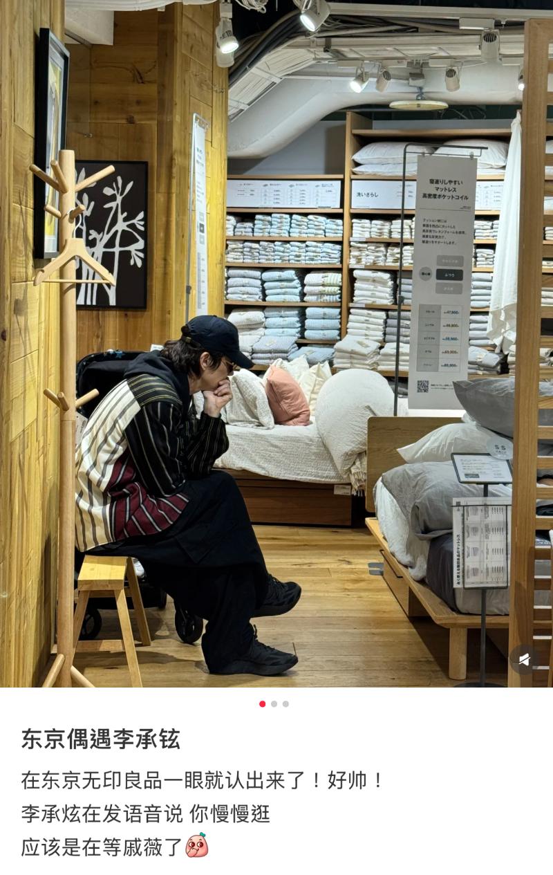 除了在代官山被偶遇,一家人逛Muji也被遇見,只不過這次網友遇到了獨自帶娃的李承鉉!根據網友表示,聽見了李承鉉應該發了語音給戚薇,表示讓她慢慢逛👇