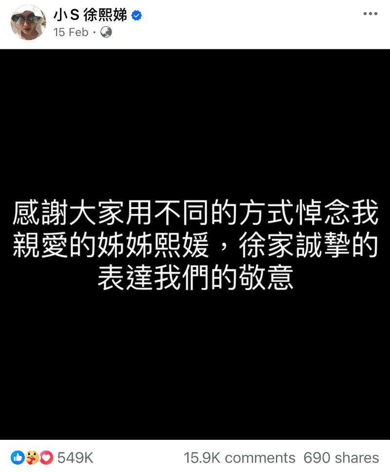 小S發文了!是噠,大S在2月初因流感在日本驟逝後,小S全面停工消失在熒幕前,至今只發過幾篇和姐姐相關的貼文,但都沒有提及自己心情,像是一開始的感謝大家的悼念👇