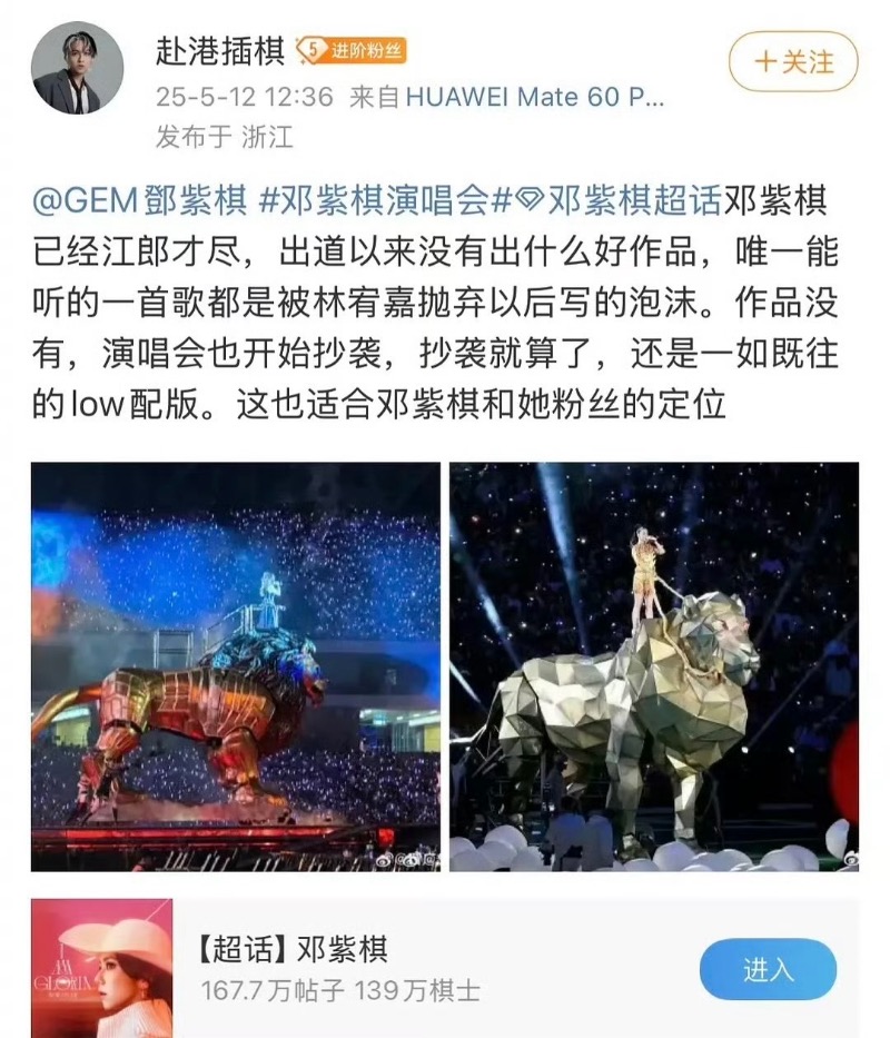 沒想到在12號這天,林宥嘉居然空降鄧紫棋超話?是達,起因是有個黑粉在超話發帖,抹黑鄧紫棋江郎才盡,除了在被林宥嘉拋棄後寫的《泡沫》外全無作品,就連演唱會都開始抄襲!值得一提的是,這位網友的頭像還是林宥嘉的照片👇