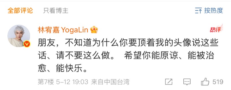 沒想到林宥嘉居然用大號直接回應這位網友,表示:「朋友,不知道為什麼你要頂著我的頭像說這些話、請不要這麼做。 希望你能原諒、能被治愈、能快樂。」