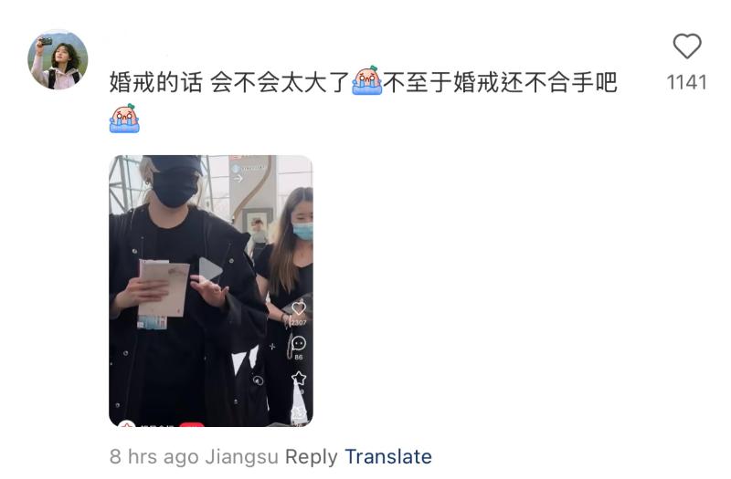 到底怎麼一回事呢?原來是有粉絲拍到了關曉彤的機場路透,只見她的左手無名指戴了戒指👇