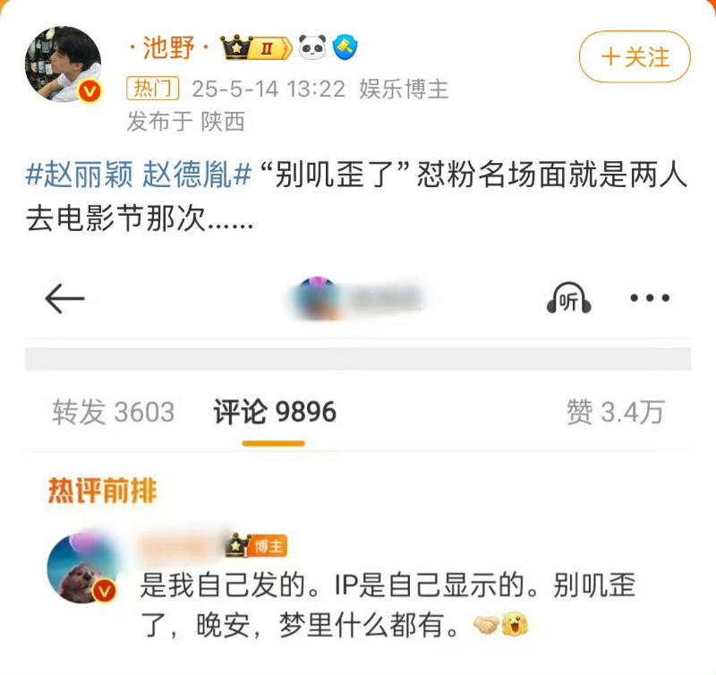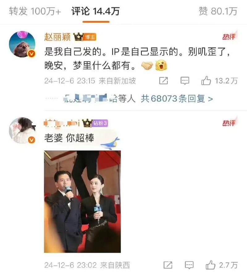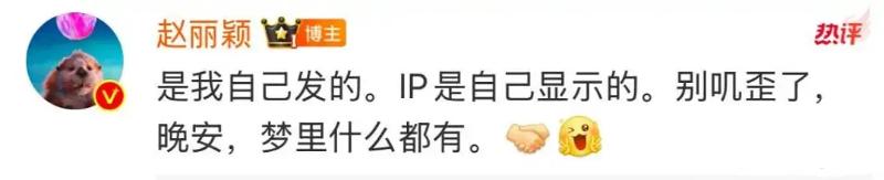 但由於微博IP顯示在北京,因此被粉絲質疑不是本人發,是出自工作人員之手,評論區吵不停時,趙麗穎在評論區回懟粉絲,表示就是她本人發的,讓大家不要再「嘰歪」👇