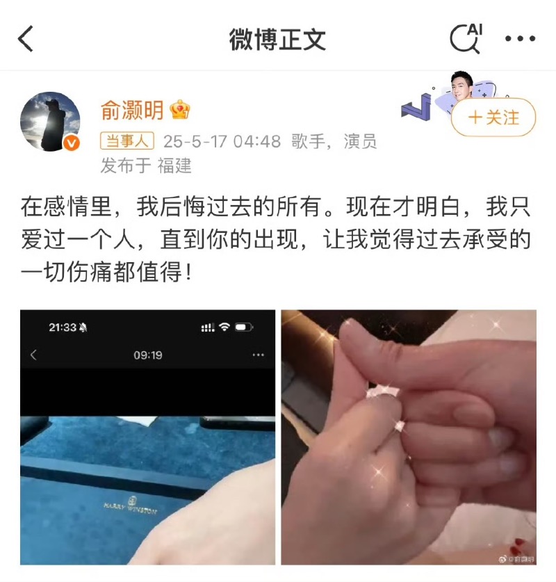 俞灝明曬出鑽戒和兩隻手拉鉤的照片,配文:「在感情裡,我後悔過去的所有。現在才明白,我只愛過一個人,直到你的出現,讓我覺得過去承受的一切傷痛都值得!」