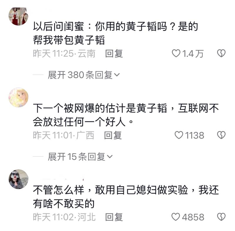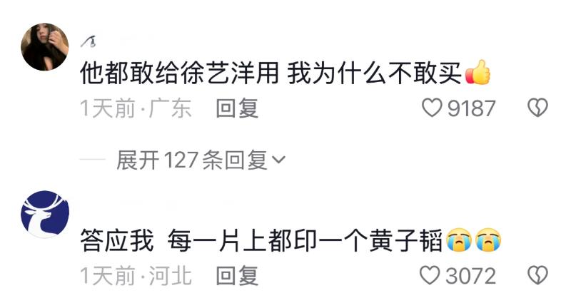 而對於黃子韜的衛生棉品牌,不少網友都給予好評,認為他既然敢給徐藝洋用,那麼有什麼理由不買?