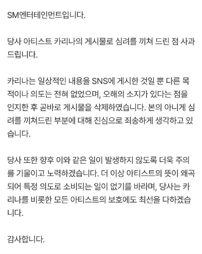 隨著熱議,Karina所屬社SM以「完全沒有目的和意圖…很抱歉讓大家擔心了」為主要內容,發表了聲明👇