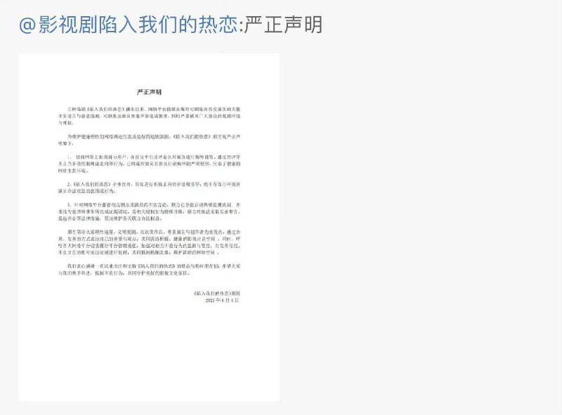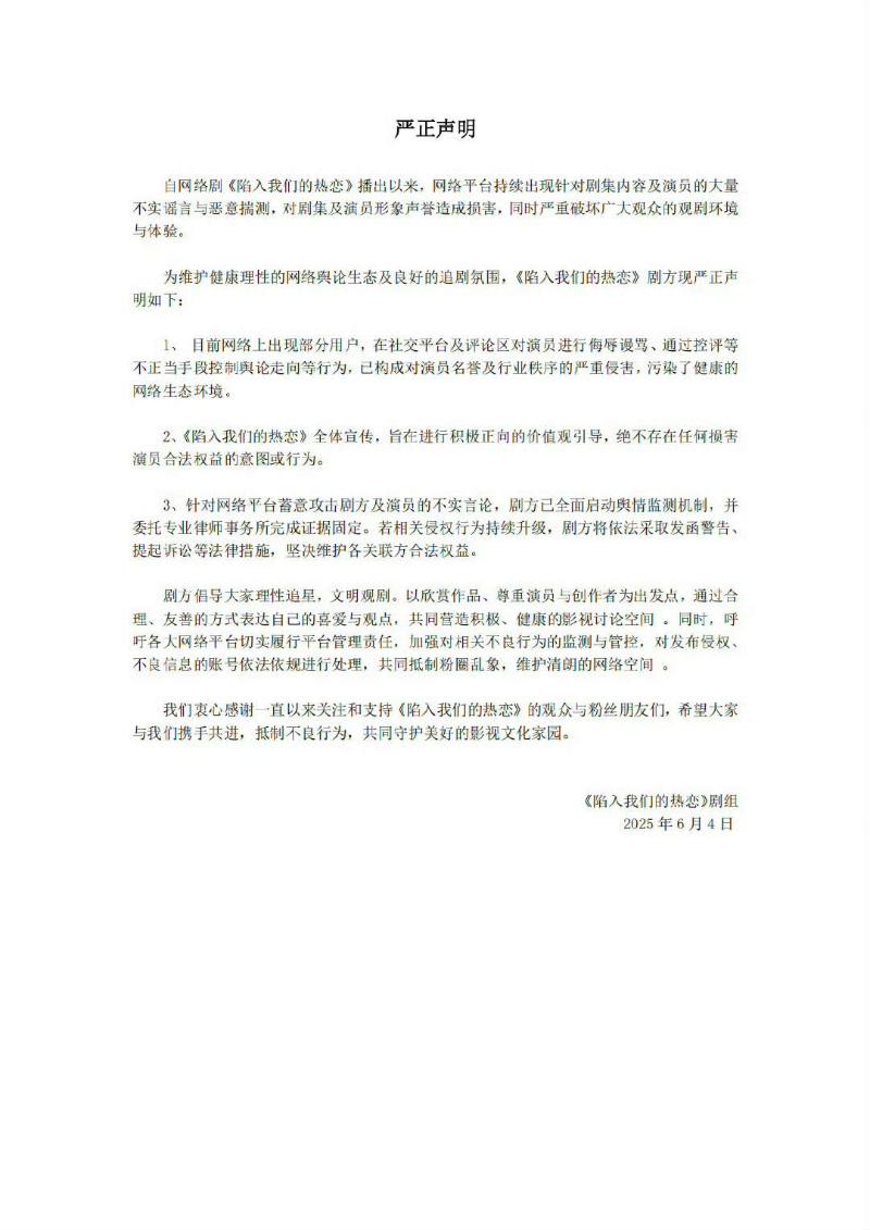 隨著越來越多網友熱議,《陷入我們的熱戀》的劇組居然發聲明回應,但聲明中態度很強硬,表示針對劇集內容和演員的不實謠言和惡意揣測,劇方將采取發函警告和提起訴訟。