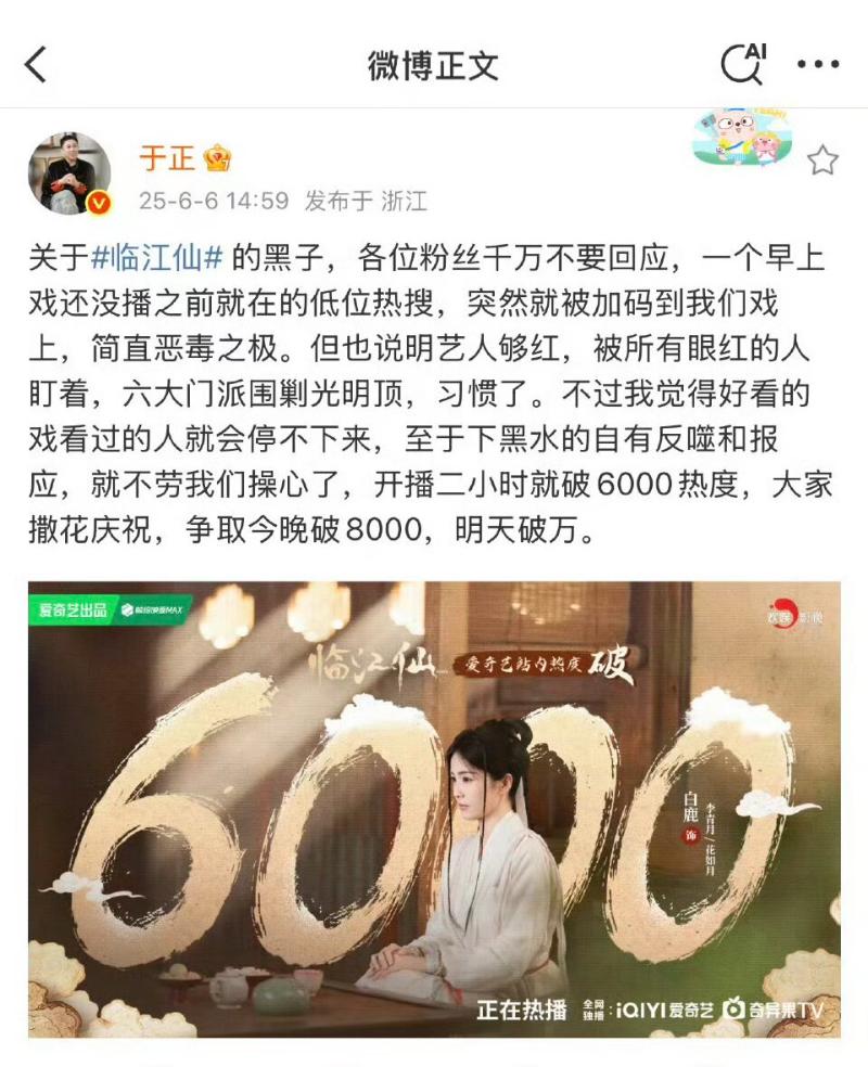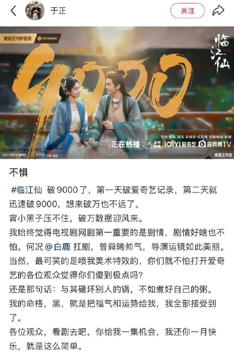 對於這麼多惡評,出品人于正也不甘示弱,三次下場回懟👇