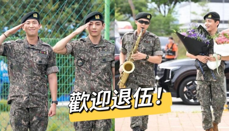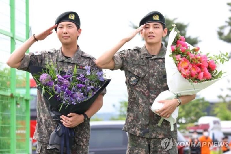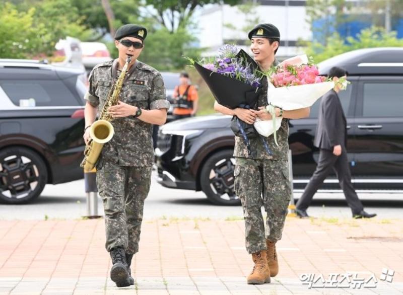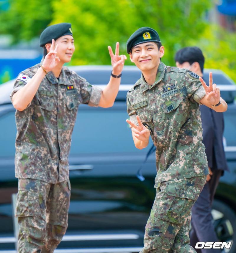 RM和V是在2023年12月以陸軍現役的身份入伍,並分別在第15師軍樂隊和第2軍團軍事警察特殊任務部隊服兵役。現身在退伍現場的兩人開心擁抱,而金南俊再次帶著他的薩克風出現在現場,吹奏了《名偵探柯南》經典BGM送給大家!