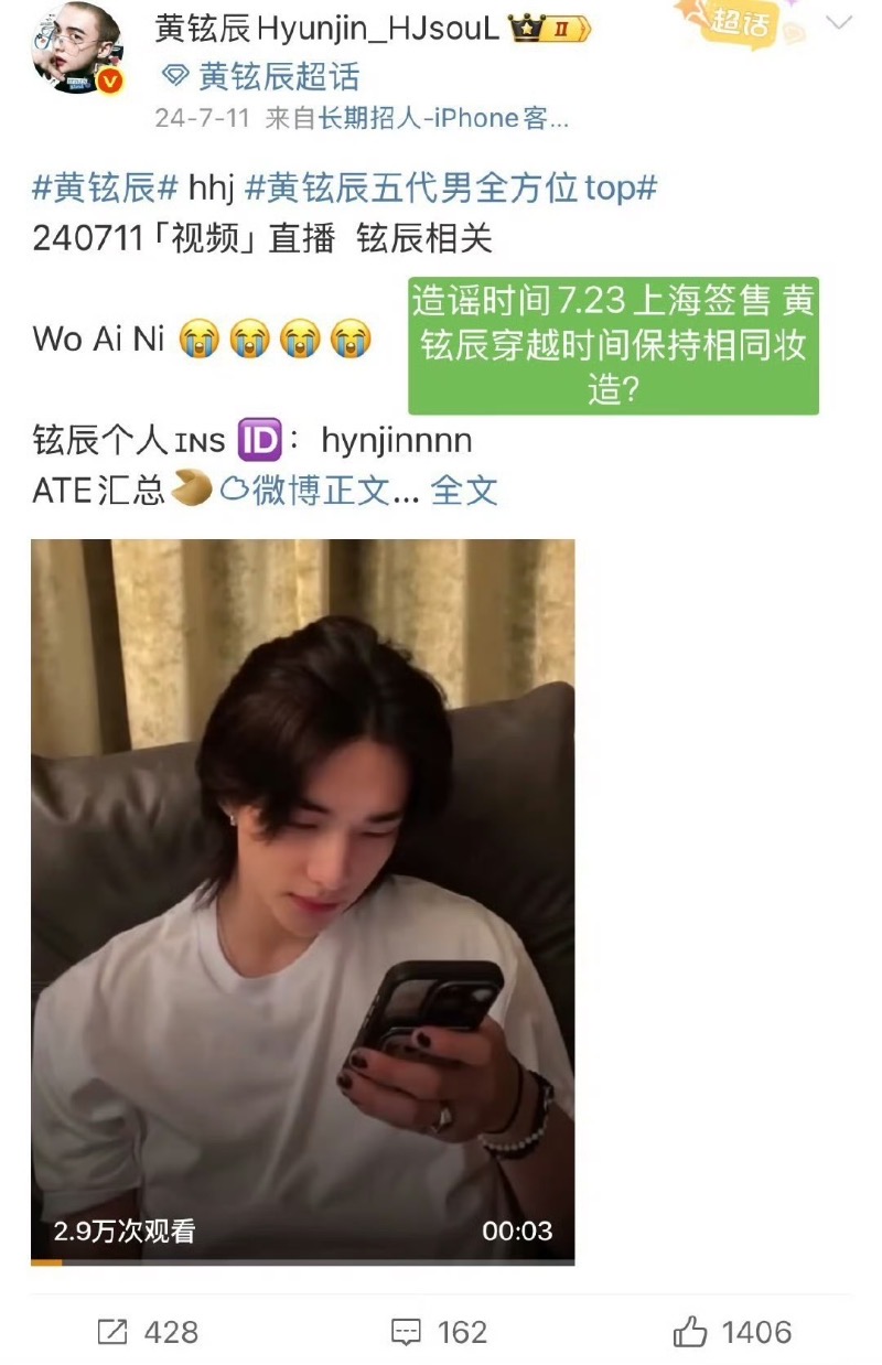雖然但是,在消息曝光之後,雙方粉絲紛紛發出澄清,先來看黃鉉辰方,表示被扒出的造型是7月11日的視頻簽售會,但跟車當天的23號,他早已經換了髮型👇