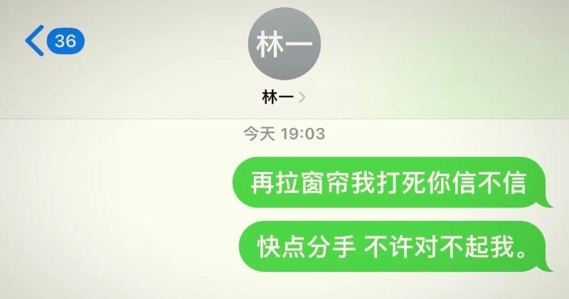 重點是,她還公開了一張聊天截圖,當中顯示收信人是林一,而聊天內容是威脅林一盡快和女友分手:「不許對不起我!」