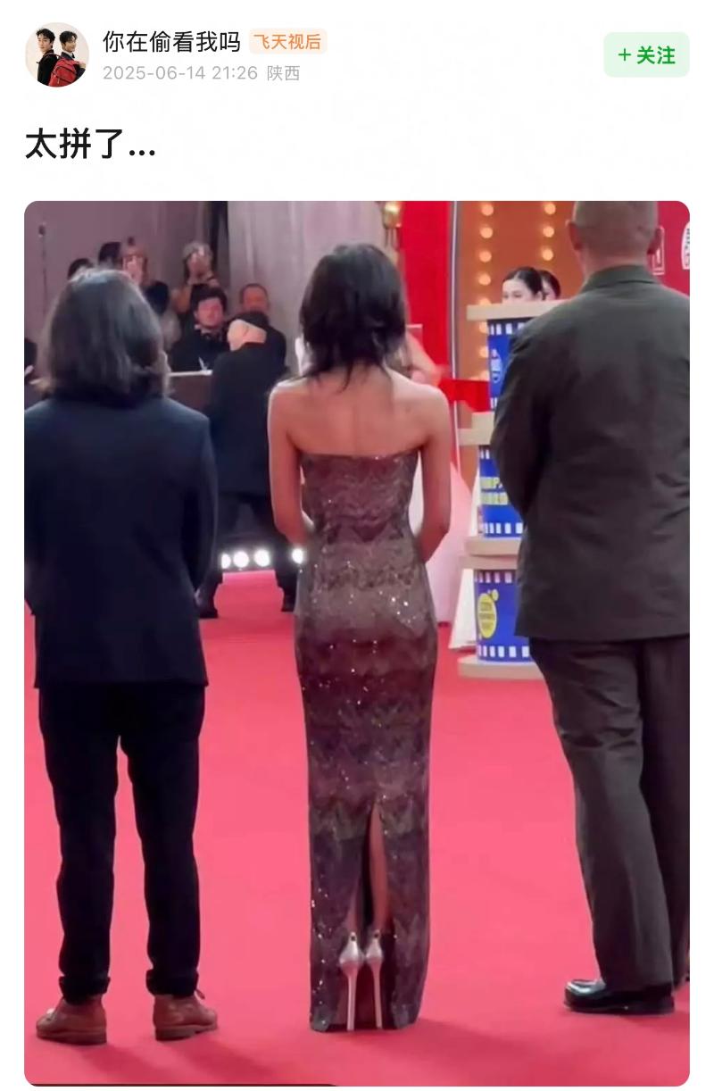 只見她穿著剪綵河神的晚禮服,落落大方的走在紅毯上👇