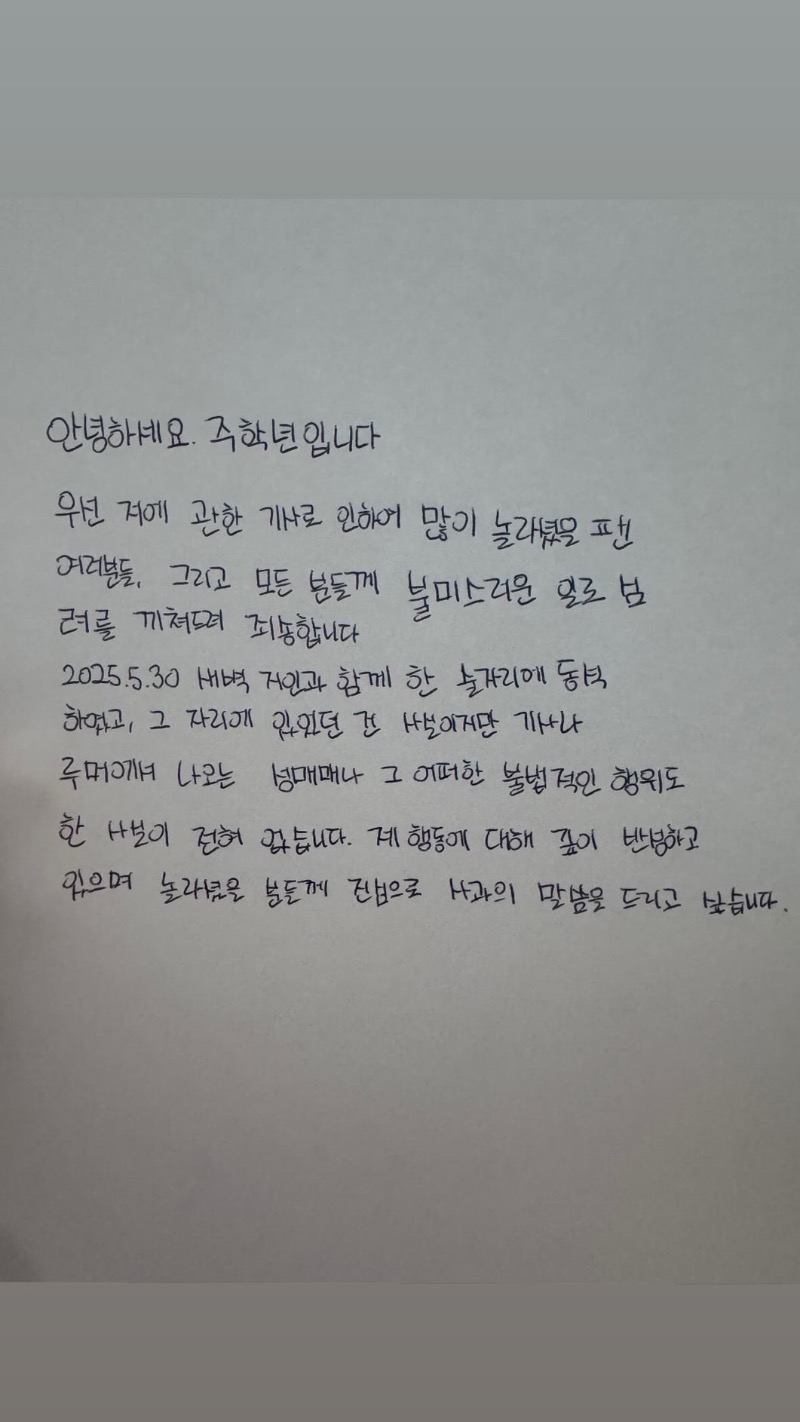 首先,對於因有關我的報道而感到驚訝的粉絲們,以及所有關心我的人,因為這次不光彩的事情給大家帶來了困擾,我深感抱歉。