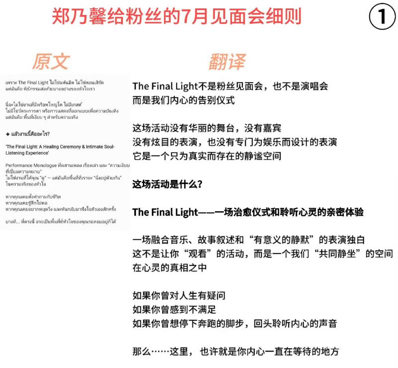 來看看,見面會強調不是普通的粉絲見面會,而是“治愈儀式”,所以福利之一是鄭乃馨給粉絲通靈,解讀粉絲的能量,並強調當天沒有華麗的舞台,整個過程要安靜,讓粉絲自己感受就行了。