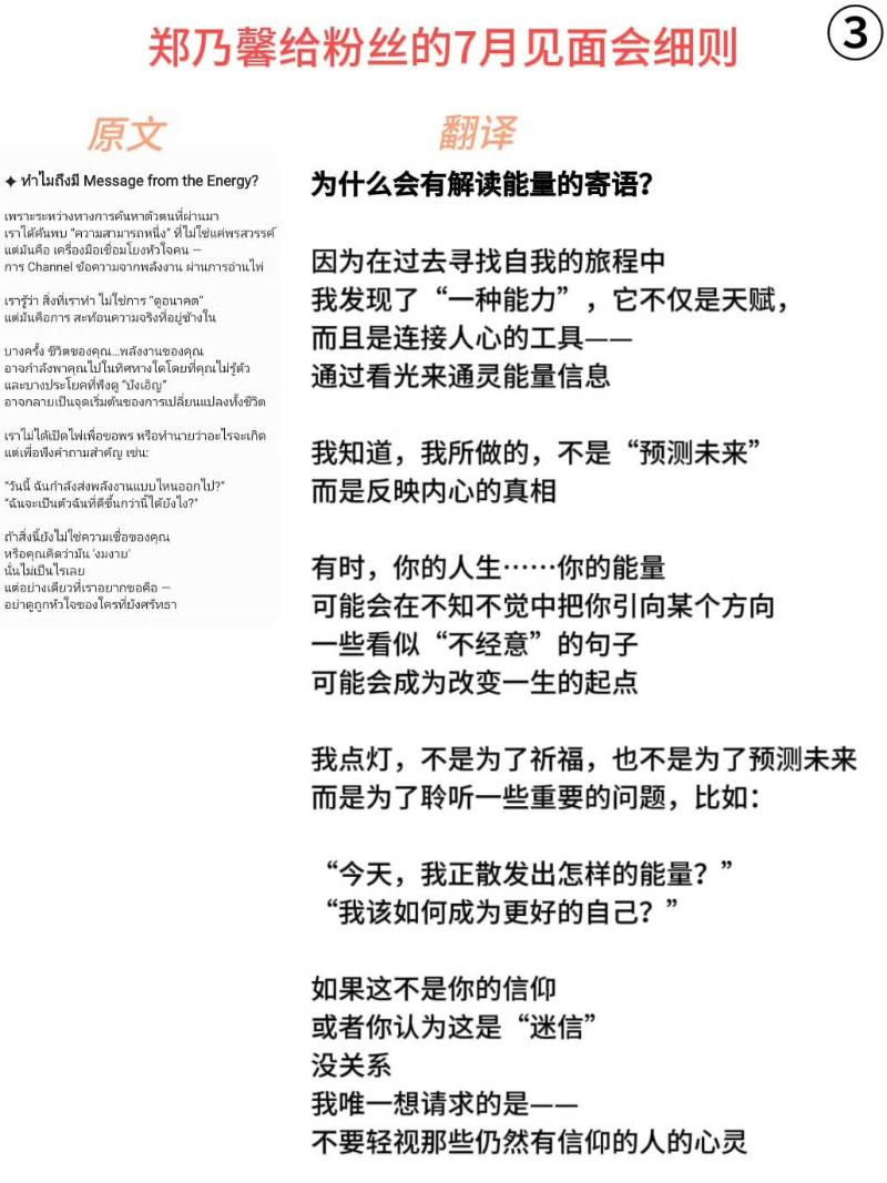 鄭乃馨還特別解釋,為什麽見面會福利裡有給粉絲“解讀能量”的環節,因為她可以通靈………:「如果你認為這是迷信,沒關係,但不要輕視那些仍有信仰的人的心靈。」