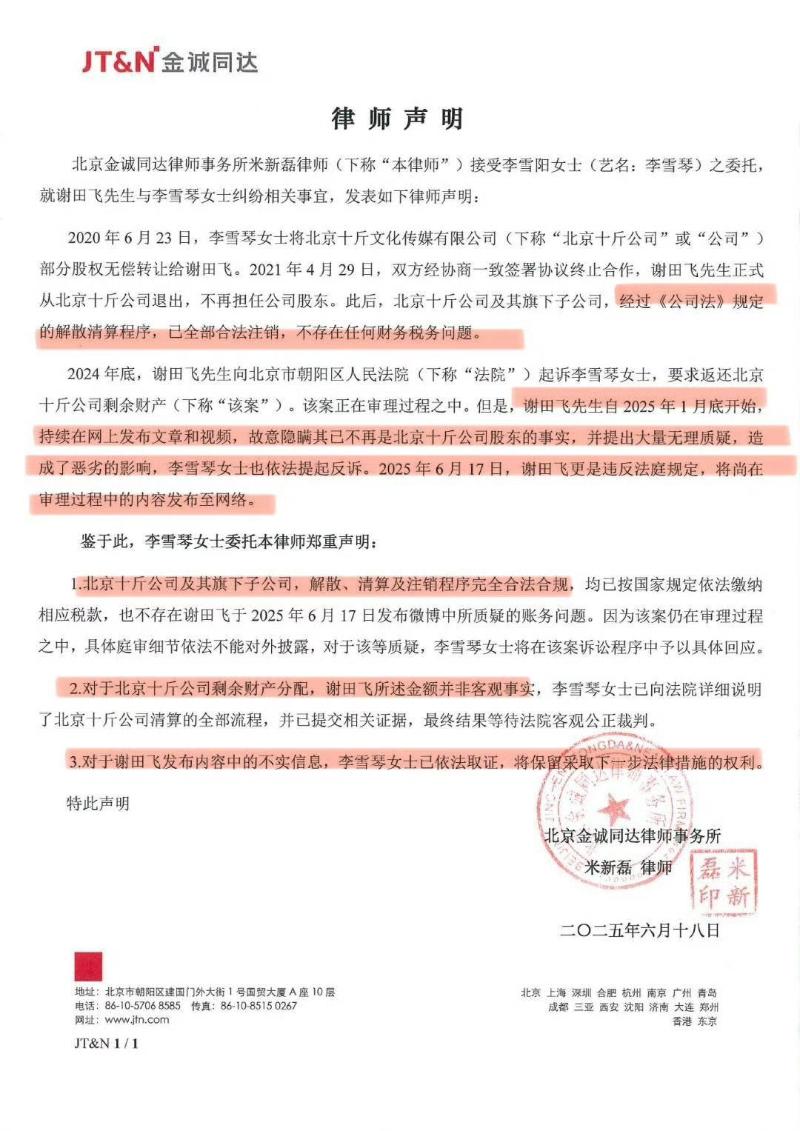 一向對此類新聞不予回應的李雪琴工作室,在當天發了聲明,重點如下: