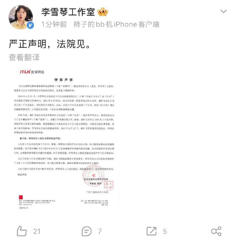 一向對此類新聞不予回應的李雪琴工作室,在當天發了聲明,重點如下: