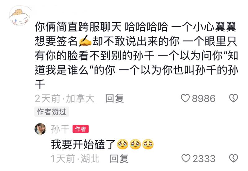 兩人之間互動時,還發生了小插曲,孫千問原Po叫什麼名字?結果原Po聽成了懂不懂她是誰,就回復了「知道,你叫孫千啊!」嚇得孫千眼睛都瞪圓了:「你叫孫千??」