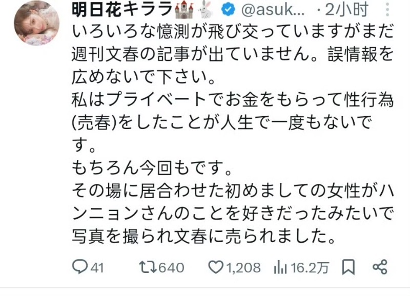 而當事人之一的明日花綺羅也在深夜更新推特,否認自己有進行性交易👇
