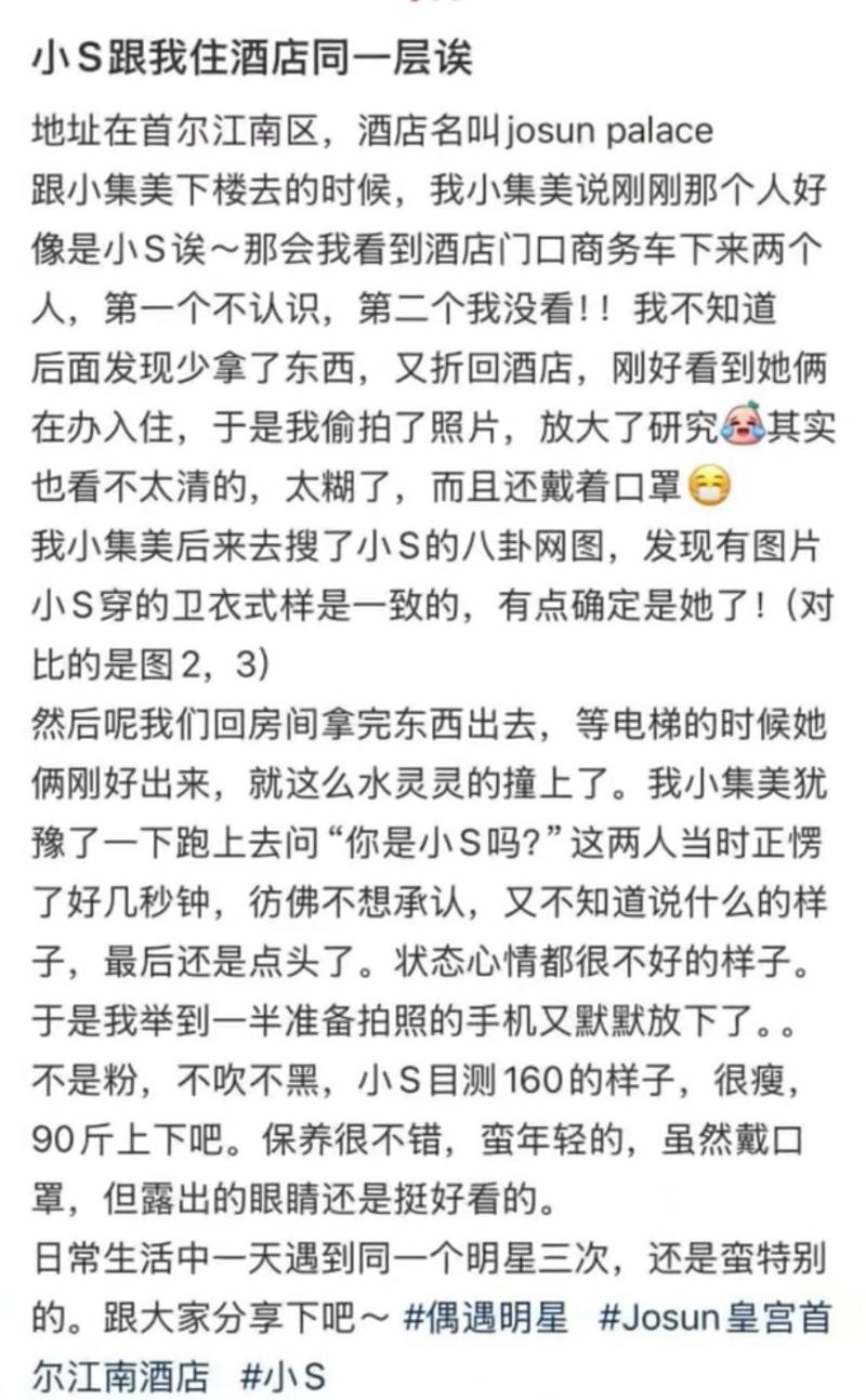 沒想到的是,居然有IP在韓國的網友發文,表示自己在23號下午在酒店偶遇了小S,說自己一開始不確定是她,一直到上網多次確認,發現她穿過同款衛衣才肯定!