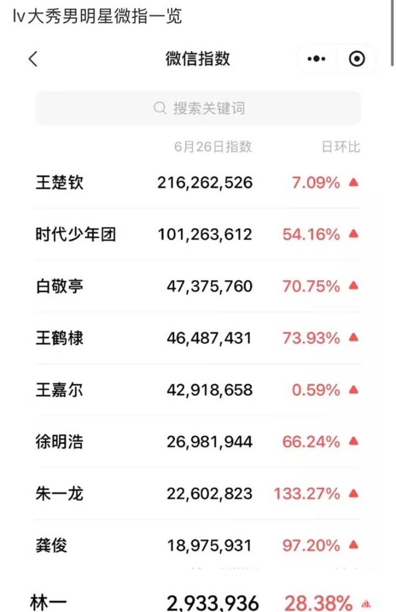 這還不止,就連LV大秀微信指數,王楚欽也是斷層第一😳