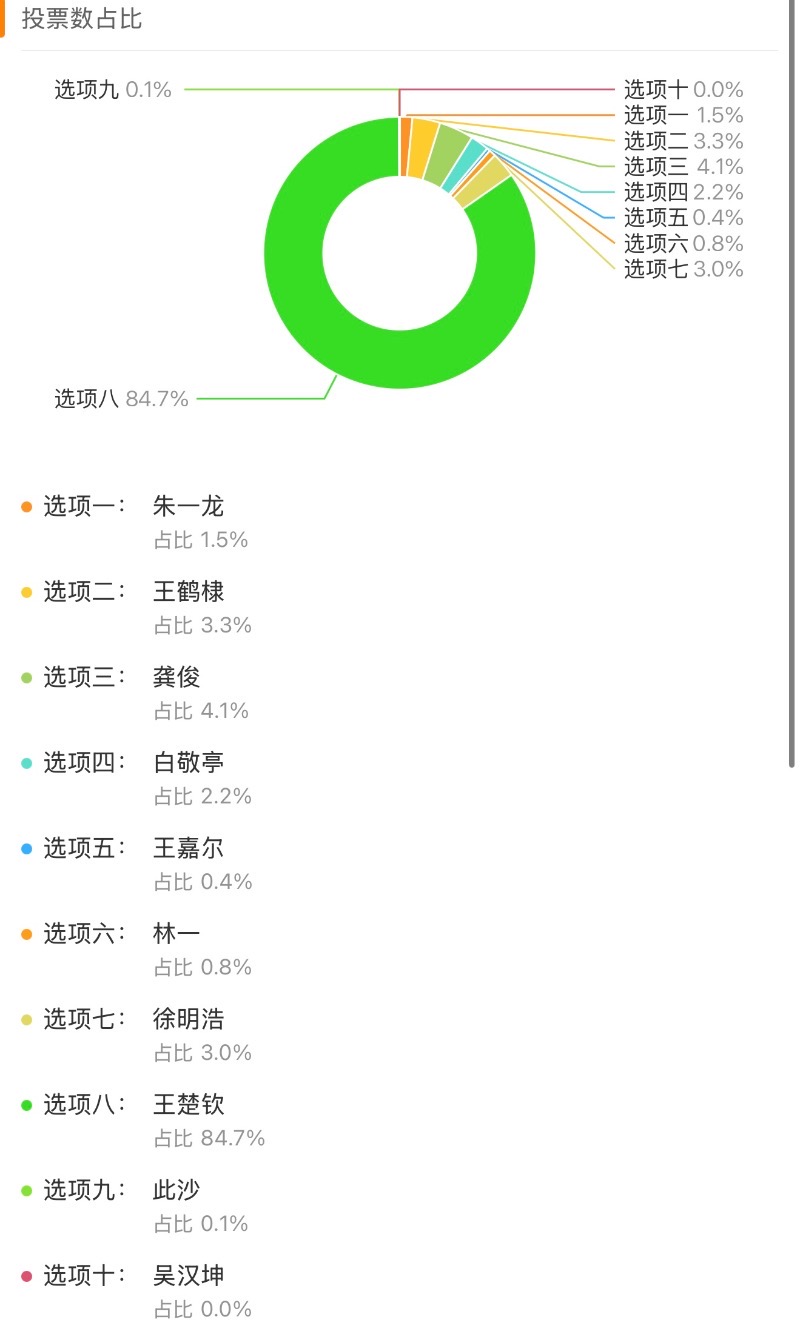 當中排名第一的,就是空降出席的王楚欽,得票突破10萬,而且得票率超過80%,相當恐怖!