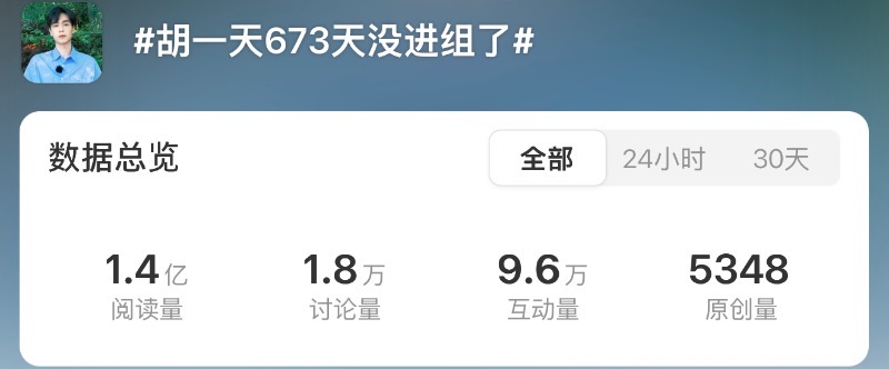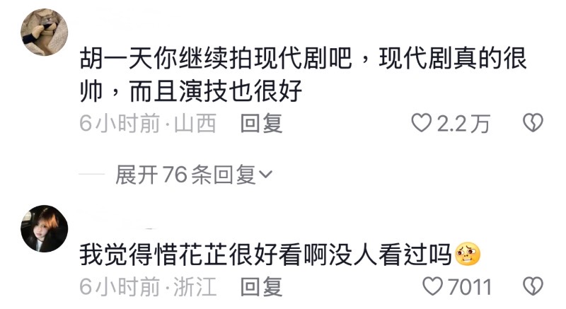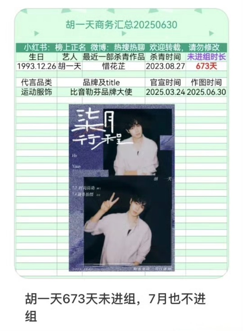 但沒想到有網友統計,截止七月一號為止,胡一天已經673天沒有進組拍攝了,他最後一部電視劇是2023年的《惜花芷》👇