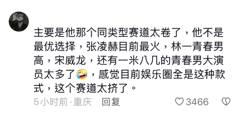 更對網友在討論為什麼不進組,當中提到最多的就是同類型男藝人太多,目前他的頭號競爭對手就是張凌赫👇