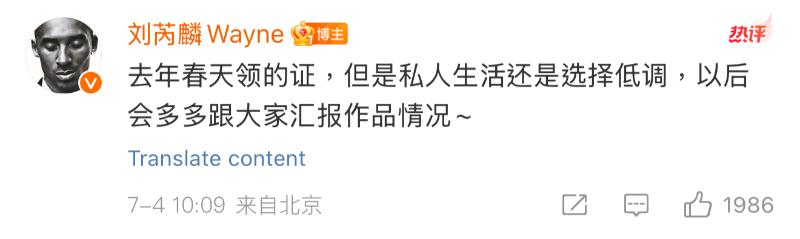 隨後他也在評論區補充,表示自己是在去年春天領的證,私人生活還是選擇低調。