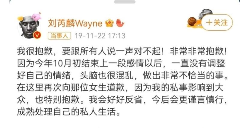 但同年11月劉芮麟被曝與女粉絲私聯且言辭暧昧,還稱自己和代斯已分手,引發爭議之後,這段感情也就此告終,劉芮麟也發文道歉。