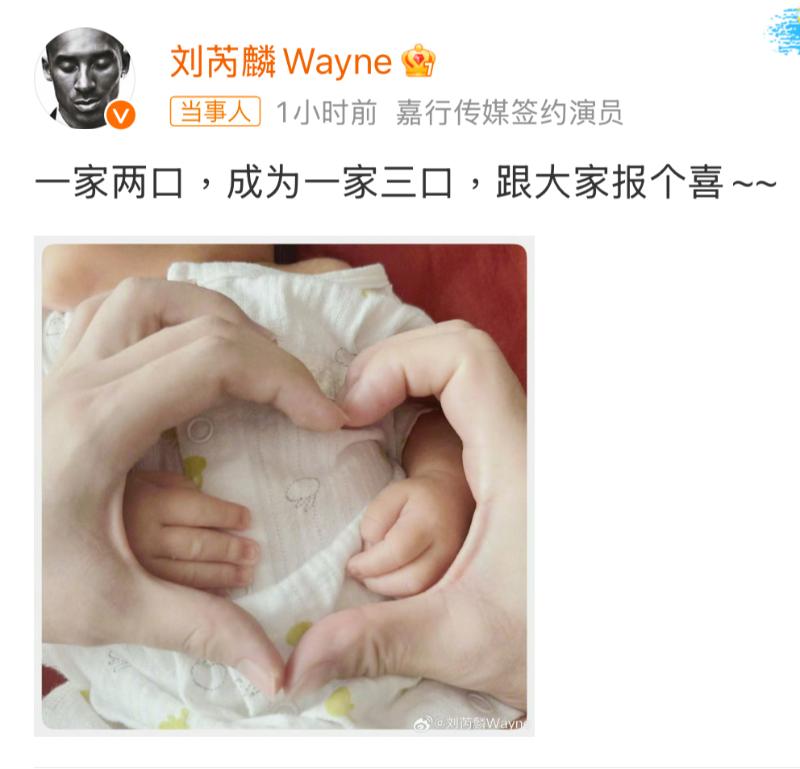 在劉芮麟的帖文中,曬出了一家三口比心照,配文:「一家兩口,成為一家三口,跟大家報個喜~」