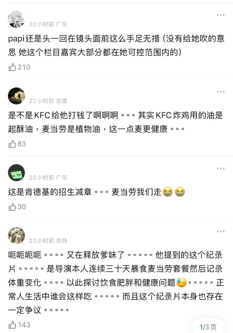 王耀慶表示就是通過這樣的教育,孩子看到麥當勞就不會進去,可以看到Papi醬這時已完全表情失控👇